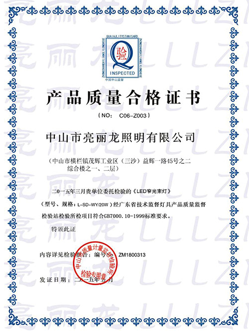 亮麗龍-LED雙窄光束燈質量合格證書