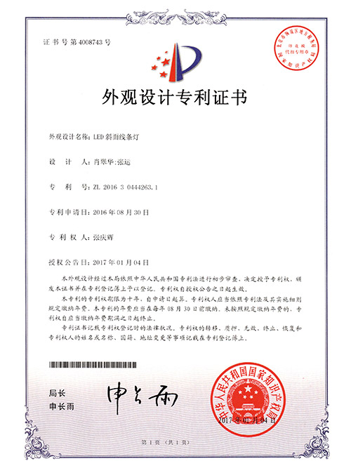 亮麗龍-LED斜面線條燈外觀設計專利證書