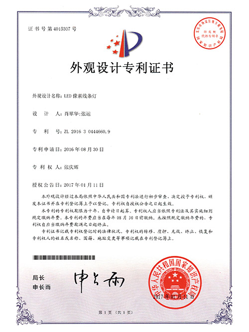 亮麗龍-LED像素線條燈外觀設計專利證書