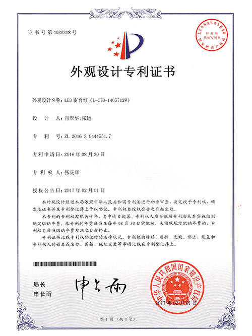 亮麗龍-LED窗臺燈外觀設計專利證書