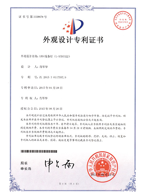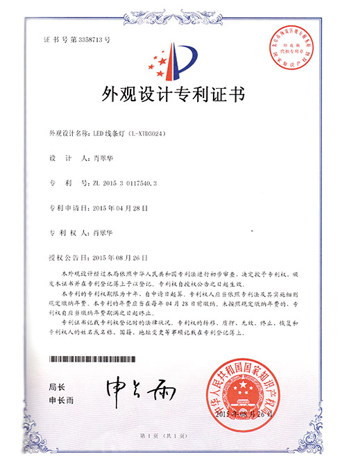 亮麗龍-LED線條燈外觀設計專利證書(L-XID3024)