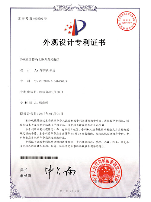 亮麗龍-LED八角光束燈外觀設計專利證書