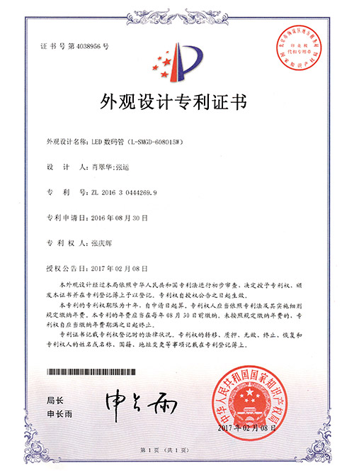 亮麗龍-LED數碼管外觀設計專利證書
